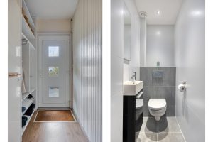 Begane grond: via de overdekte entree kom je binnen in het tochtportaal met garderobe en meterkast. Vervolgens de hal met trap naar verdieping en het moderne toilet met hangend closet en fontein.