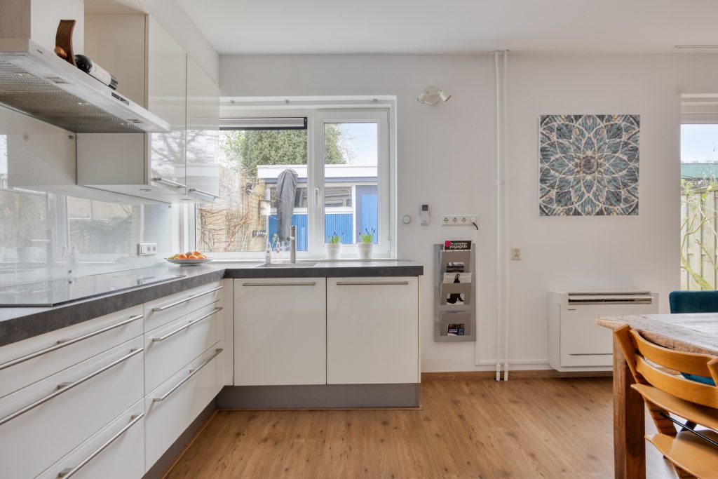De keuken is uitgevoerd in een nette hoekopstelling en beschikt over diverse inbouwapparatuur, waaronder een vaatwasser, inductiekookplaat, koelkast en oven. Dankzij de royale maatvoering is dit echter méér dan alleen een keuken: hier is sprake van een echte woonkeuken. Er is volop ruimte voor een grote eettafel waar je lang natafelt met vrienden of uitgebreid ontbijt in het weekend. Daarnaast biedt de indeling mogelijkheden voor het realiseren van een kookeiland, waarmee je de ruimte nóg meer tot het hart van de kan maken.