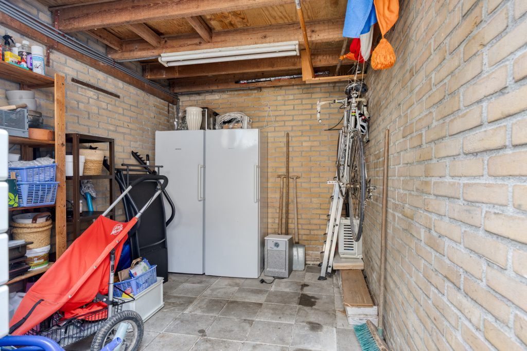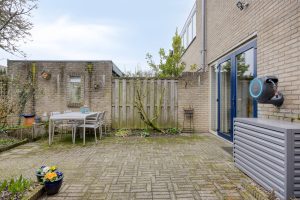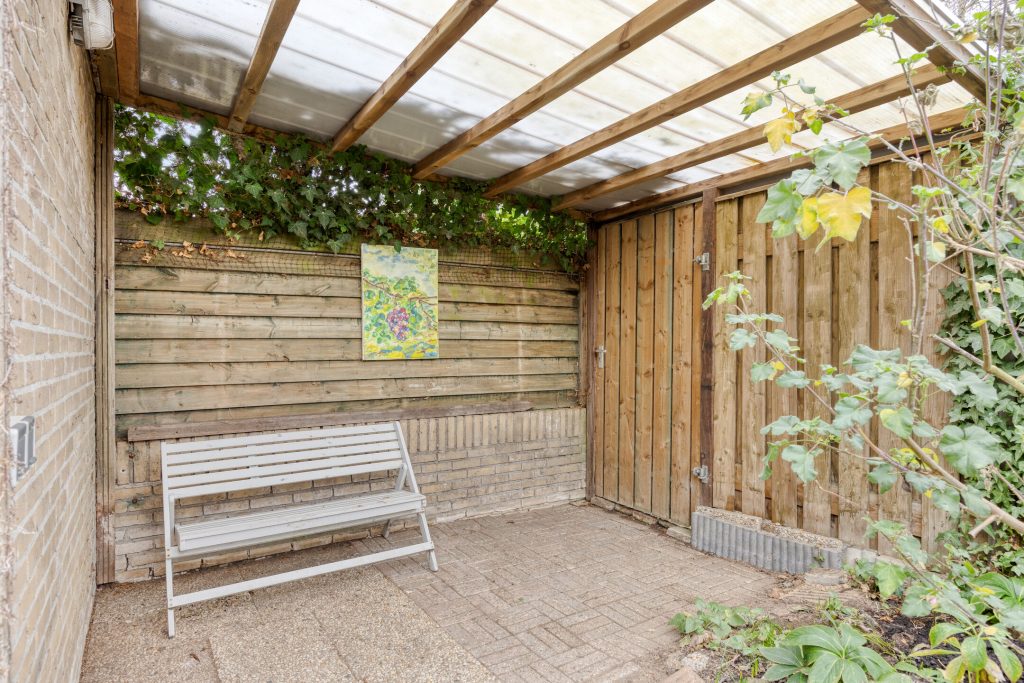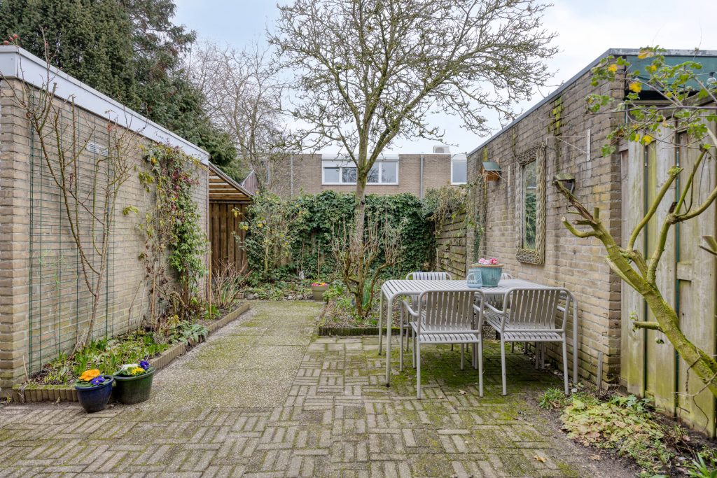 De achtertuin is circa 11 meter diep en gelegen op het oosten. Dat betekent volop ochtend- en middagzon maar zeker ook nog een stuk avondzon omdat de woning twee woonlagen telt. Heerlijk wakker worden met een kop koffie in het eerste zonlicht. Door de diepte van de tuin is er altijd een fijne balans tussen zon en schaduw gedurende de dag. Er is een stenen berging met elektra en een overkapping die ideaal in te zetten is voor extra opslag of een beschutte zitplek.