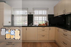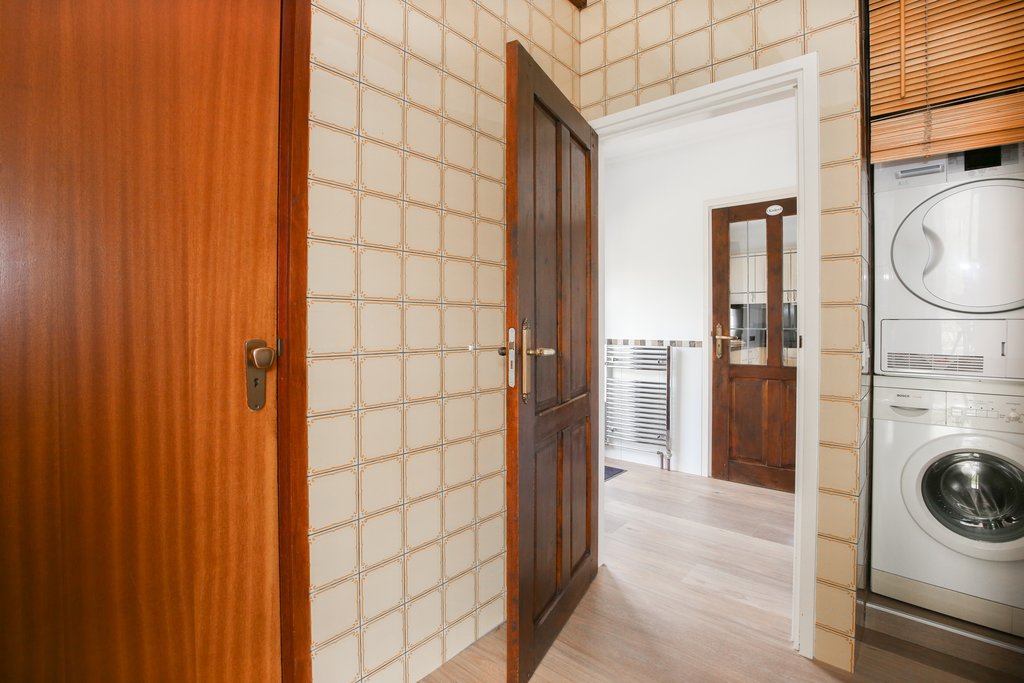 Centrale hal met vide en meterkast. De centrale hal biedt toegang tot de woonkeuken en de slaapkamer op de begane grond. De woonkamer met openslaande deuren naar de tuin is voorzien van een PCV-vloer en beschikt over een natuursteen schouw met daarin een gashaard. De woonkeuken beschikt over een uitgebreide keukeninrichting en een granieten aanrechtblad, vanuit de keuken bereikt u het achterportaal met toilet (wandcloset) en bijkeuken met Cv-installatie, werkkast en de opstelling van de wasmachine -en wasdroger.