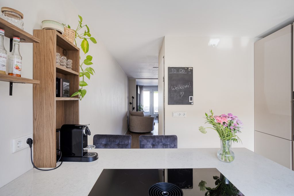 De luxe keuken aan de voorkant is in 2022 vernieuwd en heeft een rustige, moderne uitstraling. Het kookeiland met bar maakt het een plek waar je niet alleen kookt, maar ook makkelijk blijft hangen voor een kop koffie, ontbijtje of een borrel.