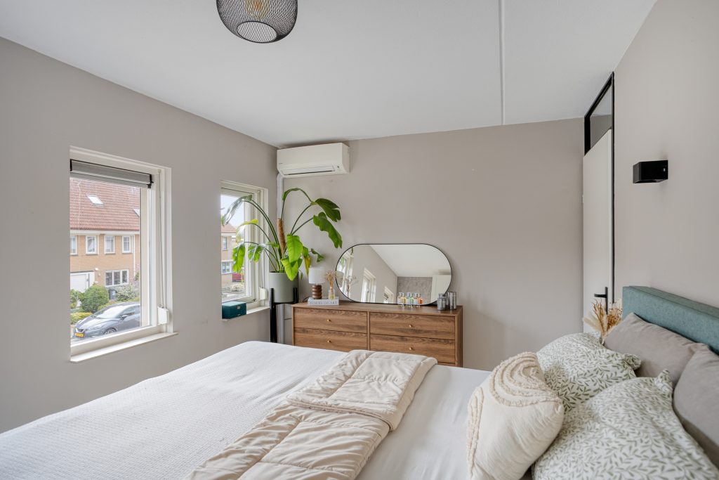 De overloop geeft toegang tot twee ruime slaapkamers en de badkamer. Met een kleine aanpassing is hier eenvoudig een extra slaapkamer te realiseren. De slaapkamers liggen aan weerszijden van de woning, waarbij de kamer aan de voorzijde is voorzien van rolluiken en airconditioning. De badkamer is enkele jaren geleden vernieuwd en voorzien van een inloopdouche, grote wastafel en 2e toilet, volledig instapklaar.