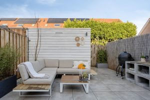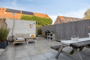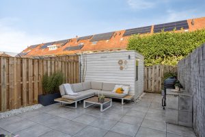 De achtertuin is ruim en netjes aangelegd, een fijne verlenging van het huis waar je heerlijk buiten kunt zitten of eten. Dankzij de onderhoudsvriendelijke bestrating en strakke afwerking oogt het geheel rustig en verzorgd. Achterin de tuin is een gezellige loungehoek waar je in alle privacy kunt ontspannen. Een berging en achterom maken het praktisch compleet.