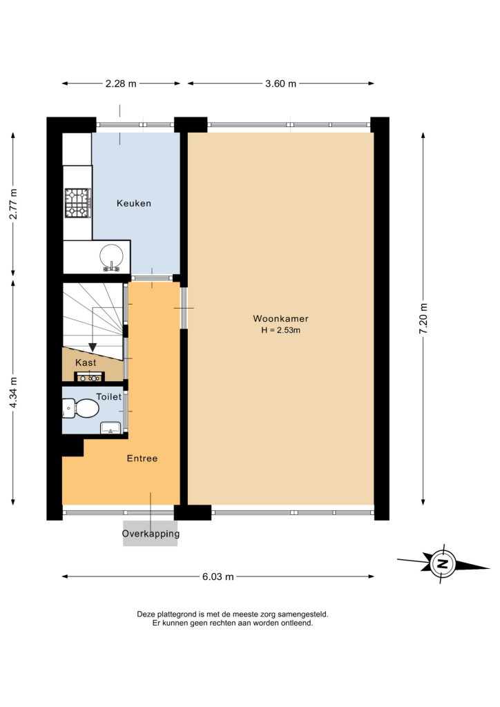 Begane grond: entree, hal, eenvoudig toilet, lichte doorzonkamer, dichte keuken met keuken in hoekopstelling. Via de keuken is er toegang tot de achtertuin met berging.