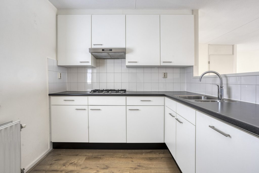 Het appartement is een maisonnette en beslaat de 1e en 2e verdieping van het complex. Vanuit de hal met wc, berg/cv-kast en de trap naar boven, loop je rechtdoor de woonkamer in, een fijne zonnige ruimte met grote raampartijen. Het balkon (circa 11 m²) grenst aan de woonkamer. Vanaf het balkon heb je een leuk uitzicht over de winkelstraat. De woonkamer loopt door in de open keuken. De nog altijd nette keuken is praktisch ingericht en voorzien van diverse inbouwapparatuur waaronder een vaatwasser en gaskookplaat.