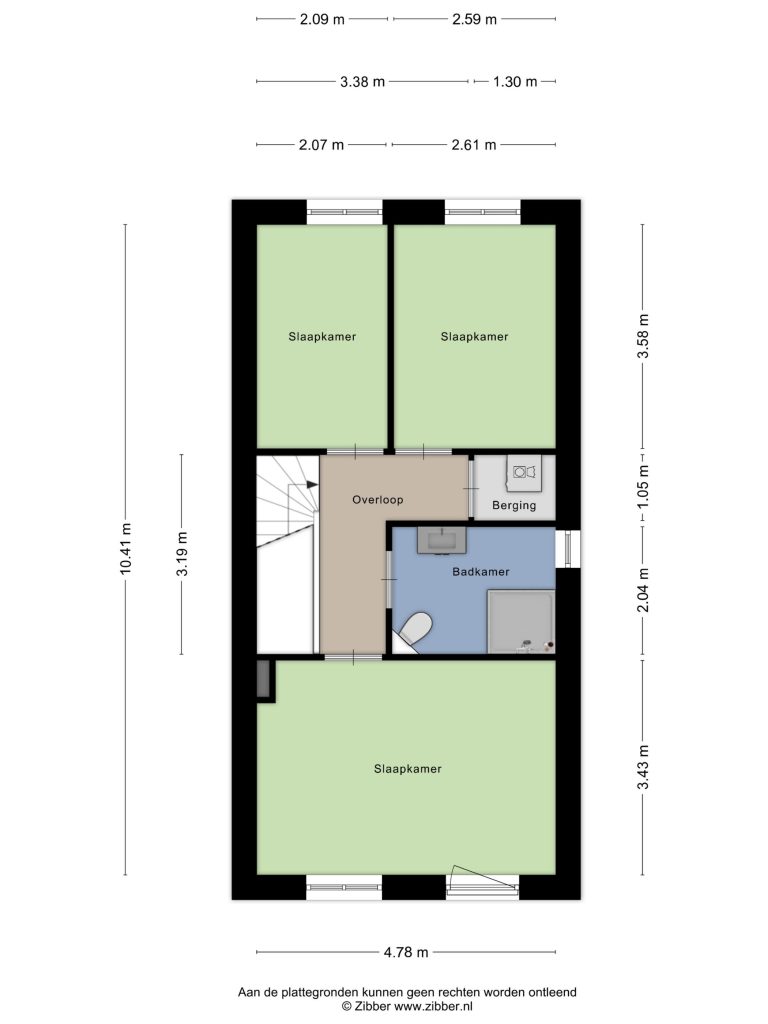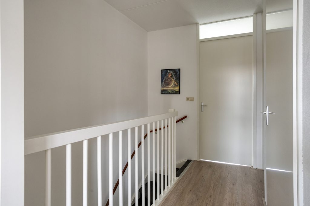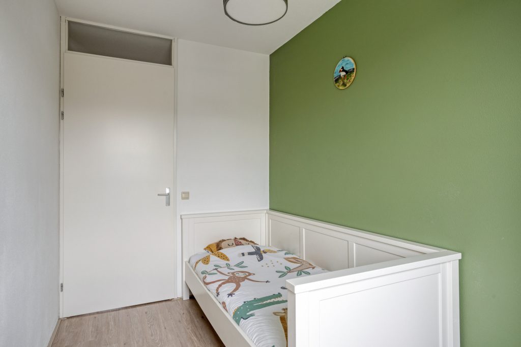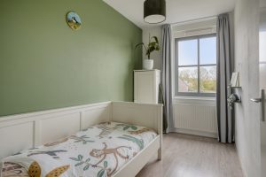 Overloop met toegang tot drie slaapkamers en een inpandige berging met witgoedaansluitingen. De riante master bedroom ligt aan de voorzijde en biedt volop ruimte voor een groot tweepersoonsbed en een royale kastenwand. Daarnaast beschikt de kamer over een charmant Frans balkon, wat zorgt voor extra licht en een aangename sfeer. Aan de achterzijde bevinden zich twee slaapkamers, ideaal als kinder-, werk- of hobbykamer. Samenvoegen behoort tot de mogelijkheden. De badkamer is netjes uitgevoerd met toilet, wastafel, douche, kolomkast en daglicht via het zijraam.