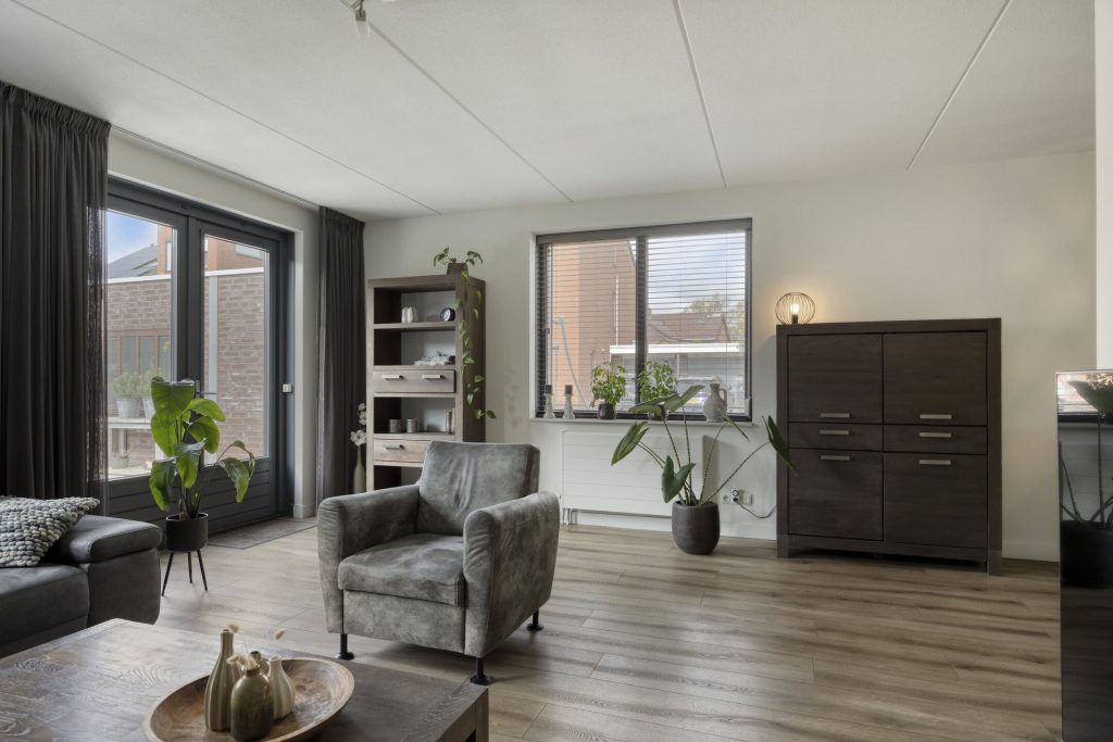 De woonkamer aan de achterzijde is heerlijk licht dankzij de grote raampartijen en openslaande deuren naar de tuin. Hier geniet je van een fijne verbinding tussen binnen en buiten. De nieuwe vloer draagt bij aan de moderne en sfeervolle uitstraling.